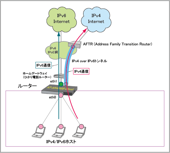 | LAN側(eth0)IPv6アドレス | DHCPv6 PDで取得したIPv6プレフィックスにもとづいて設定 |