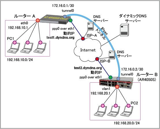 NoteルーターA、Bが使用するホスト名やダイナミックDNSサーバーにアクセスするためのアカウントは、あらかじめ取得してあるものとします。