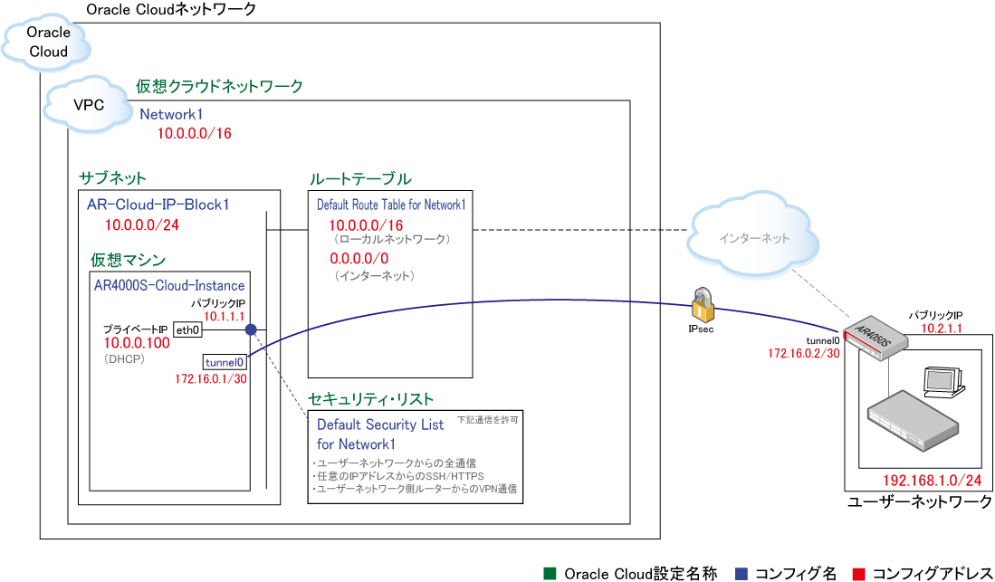 そのため、VPN接続の設定は本製品自身に対して行います。VPN接続自体についてOracle Cloud(VPC)側の設定は基本的に不要ですが、セキュリティ・リストに関しては、ARルーターからのVPN通信を許可するようイングレス・ルールを追加してください。