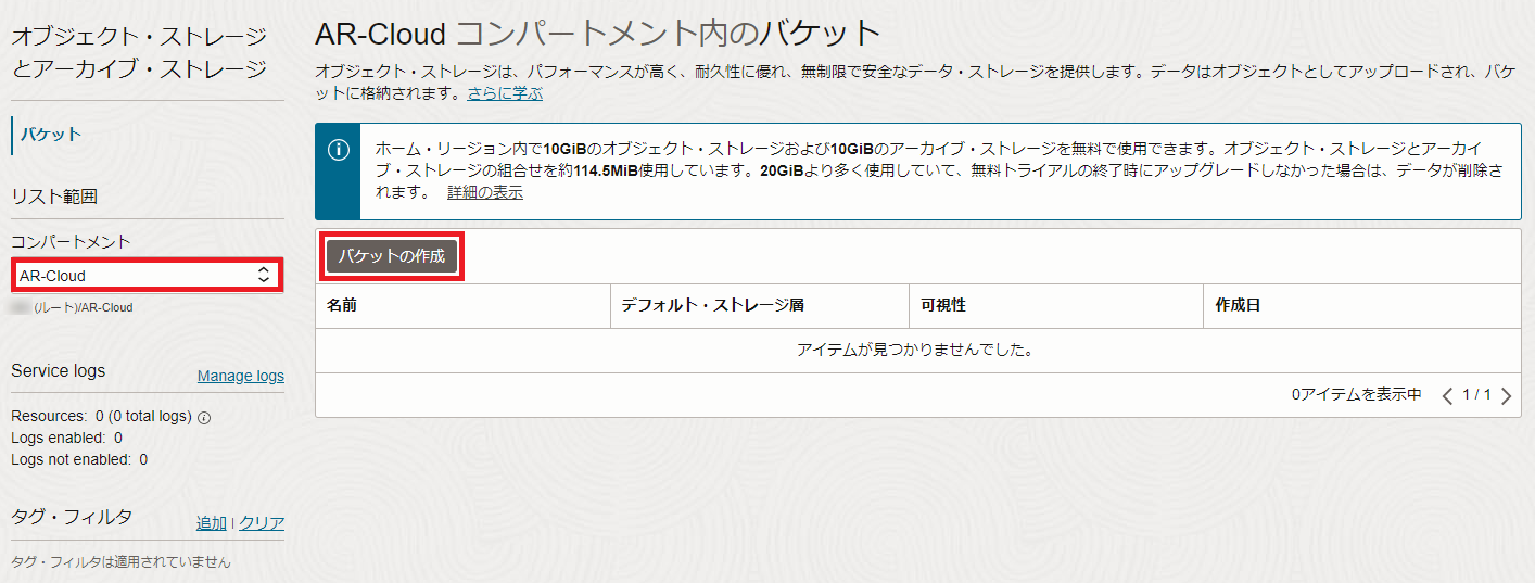 左メニューの「コンパートメント」から事前に用意したコンパートメント を選択し、「バケットの作成」ボタンをクリックします。