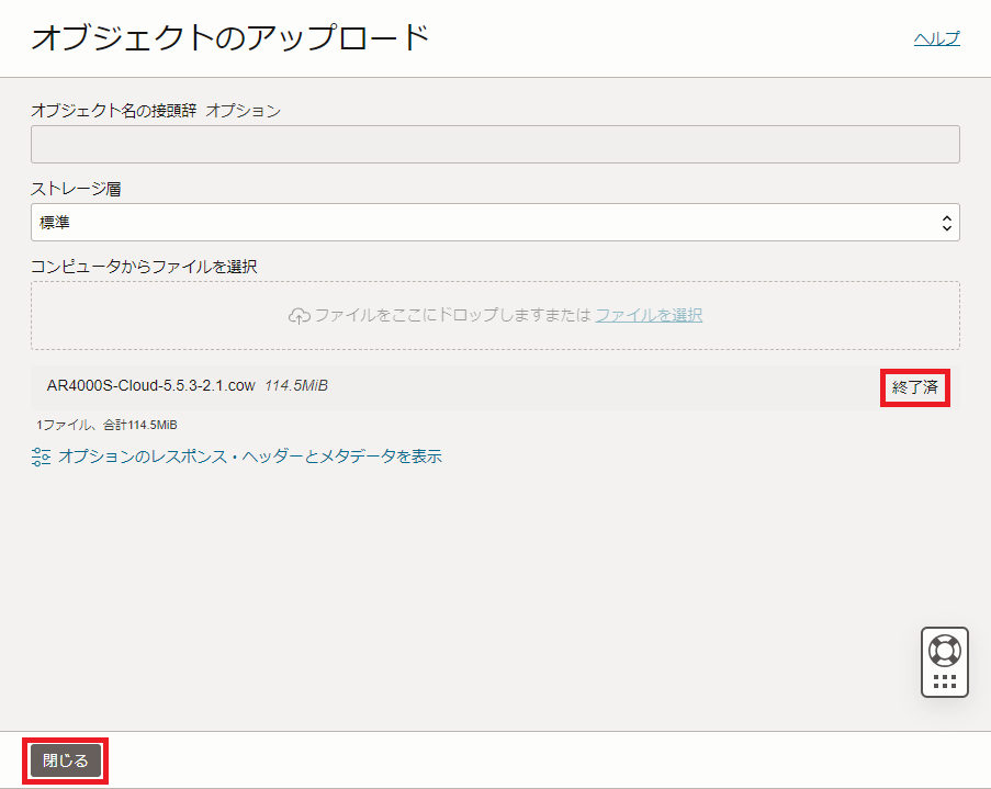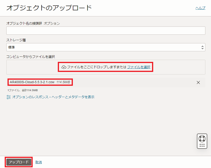 「コンピュータからファイルを選択」欄に本製品のCDに収録されているOracle Cloud用のCOWイメージファイル(拡張子「.cow」のファイル)をドラッグ&ドロップし、表示されたイメージファイル名を選択して「アップロード」ボタンをクリックします。