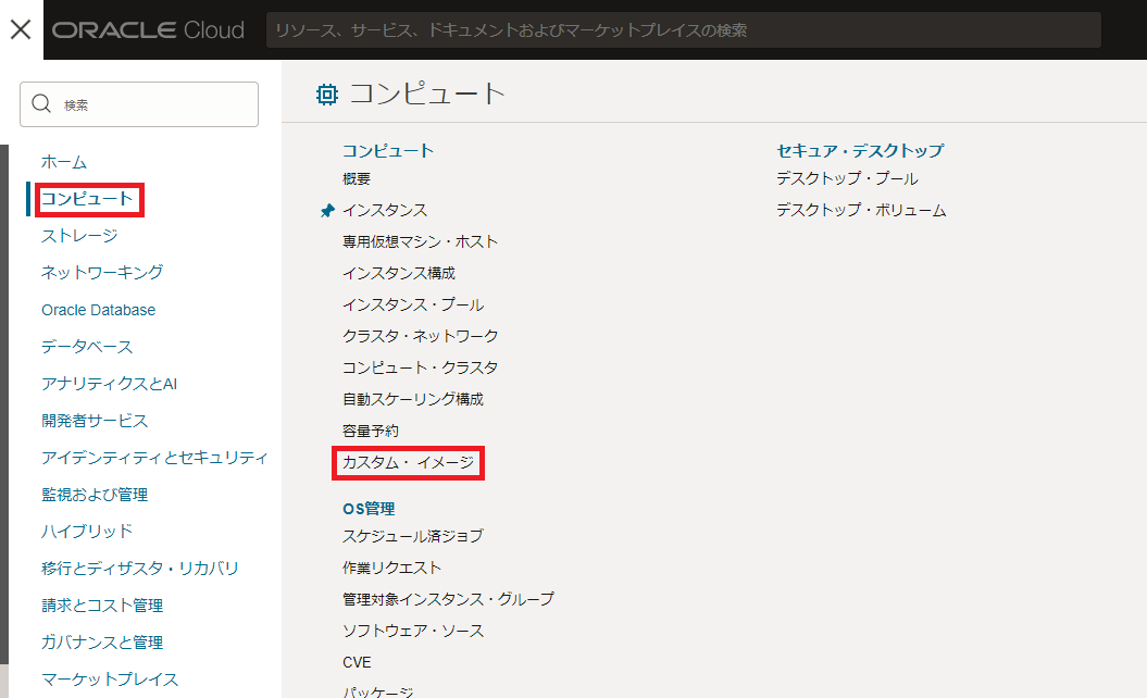 左のメニュータブから「コンピュート」>「カスタム・イメージ」を選択します。