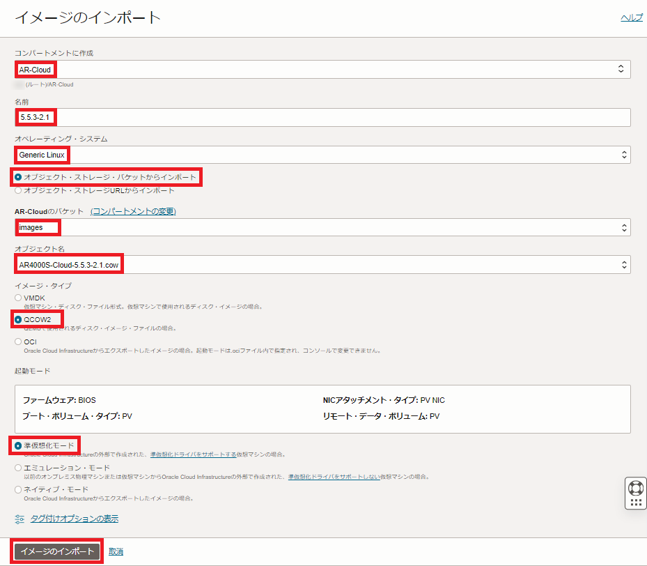 以下のとおり入力・選択し、「イメージのインポート」ボタンをクリックします。