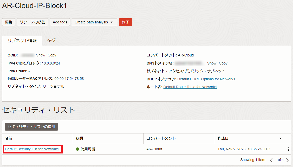 仮想クラウド・ネットワークのデフォルトセキュリティ・リストを選択します。