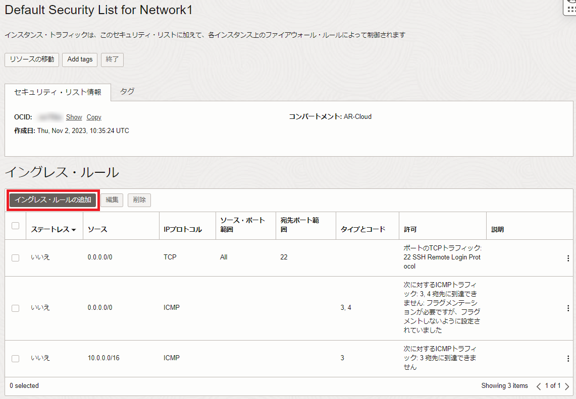 本製品のインスタンスに適用されているセキュリティ・リストに対し、ARルーターからのVPN通信を許可するイングレス・ルール を追加します。