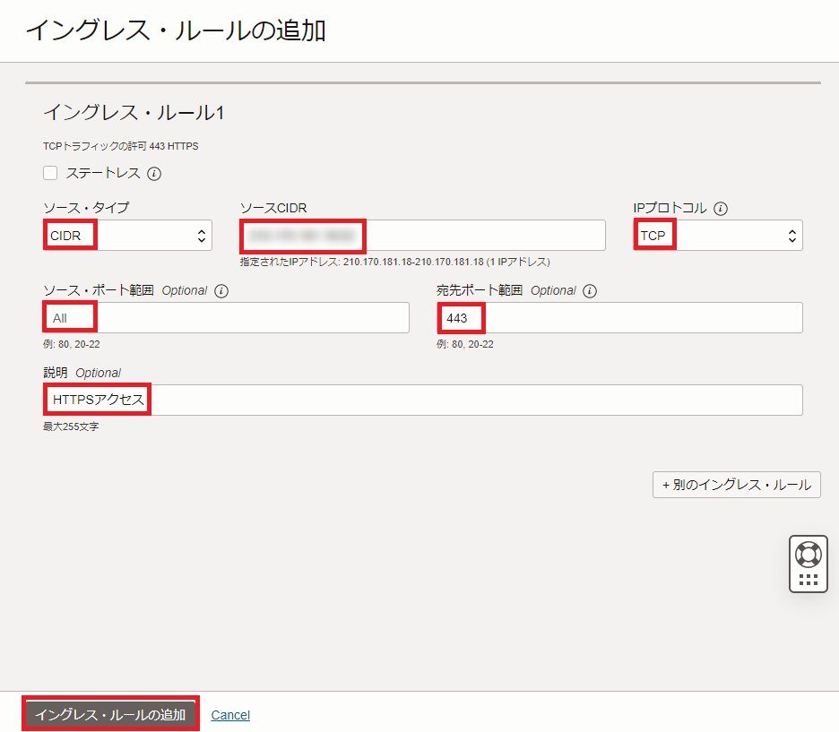 HTTPSアクセスを許可するルールを設定し、「イングレス・ルールの追加」ボタンをクリックします。
