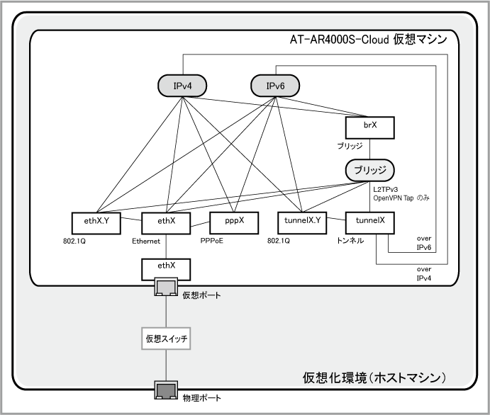 図中では「AT-AR4000S-Cloud仮想マシン」の左下にある「ethX」がAT-AR4000S-Cloudの仮想ポート(Ethernetインターフェース)です。