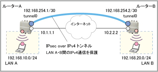 なお、前提事項として、ルーターA・BはIPv4でインターネットに接続しているものとします。WAN側インターフェースのIPアドレスは固定であり、ルーター間でのIP通信もできているものとします。
