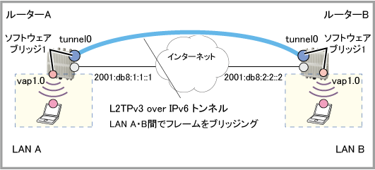 IPv6ネットワーク上にL2TPv3トンネルインターフェースを作成し、ルーターA、ルーターB配下のvap1.0同士をリモートブリッジ接続し、Ethernetフレームのブリッジングを行うには、次の手順にしたがいます。