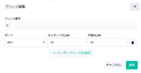 | 編集ボタン | VLAN対応ブリッジ「br0」において、該当インターフェースの所属VLAN、ネイティブVLANを変更するための「ブリッジ編集」ダイアログが開きます |