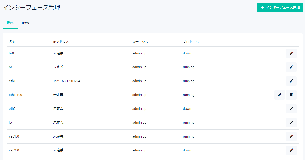| 削除ボタン | 該当インターフェースを削除します。削除できないインターフェースには「削除」ボタンは表示されません |