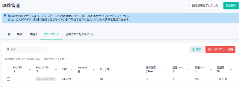 | MACアドレス | 接続しているクライアントのMACアドレスが表示されます。 |