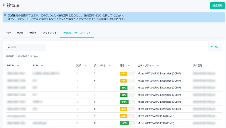 | 最終更新日時 | 最後に近隣の無線APを探索した日時が表示されます。 |
