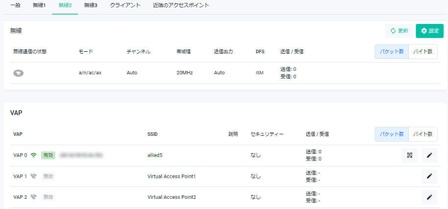 | SSID | VAPに設定されているSSIDが表示されます。各VAPのデフォルトSSIDは次の通りです。 ・VAP 0:allied24(無線1), allied5(無線2) ・VAP 1~15:Virtual Access Point1~15 |