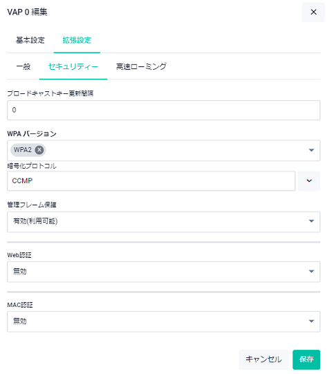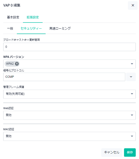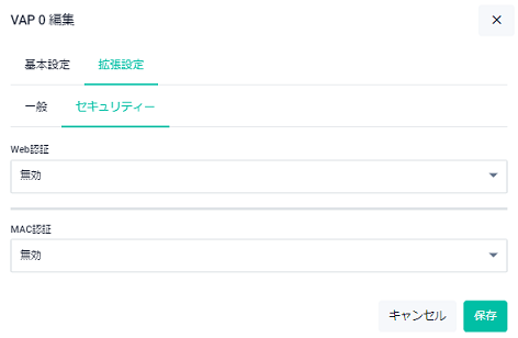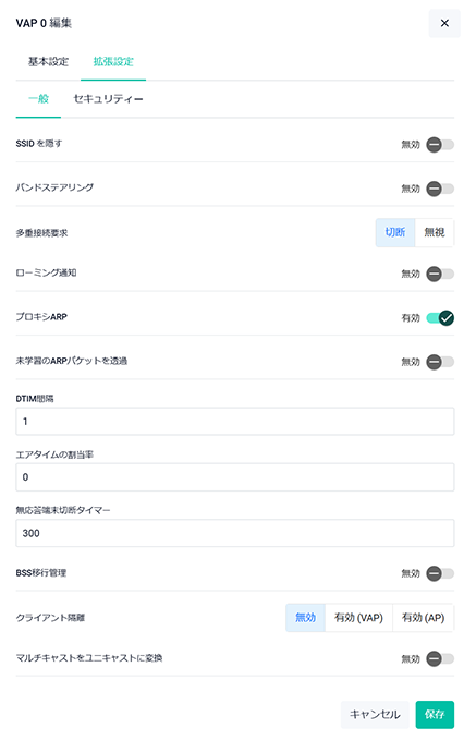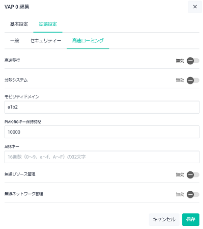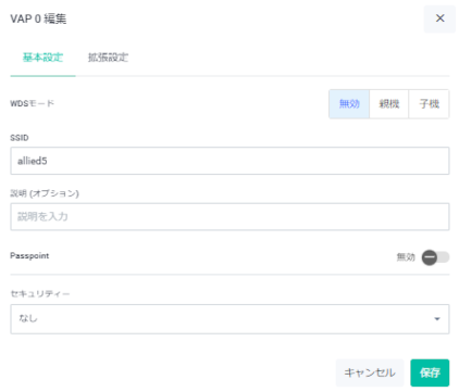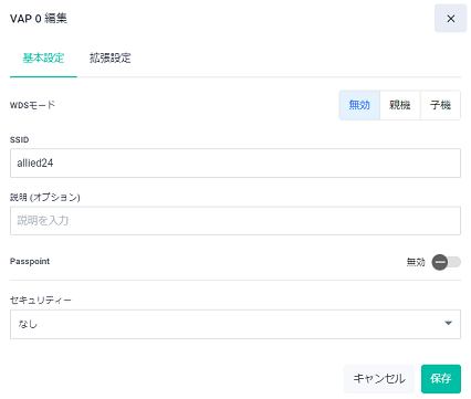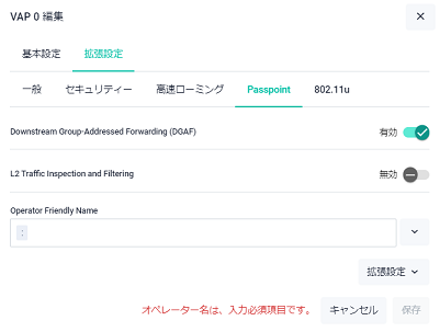 | Passpoint | Passpointの有効、無効を切り替えます。有効にすると、VAP編集画面の拡張設定タブの下にPasspointタブ、802.11uタブが表示されます。デフォルトは無効です。 |