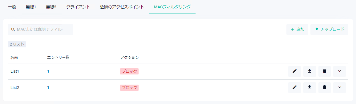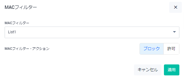 | アクション | MACフィルターのアクション(フィルタータイプ)をブロック(ブラックリスト)、許可(ホワイトリスト)から選択してください。 |