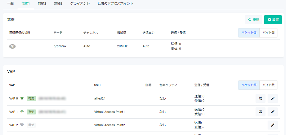 | VAP | 各VAPの設定状況が表示されます。VAPが有効の場合は緑色、無効の場合は灰色のアイコンで表示されます。 ※VAP0は常に有効で設定変更はできません。 |