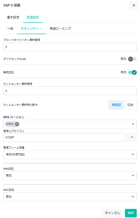 | セッションキー更新時の動作 | セッションキーの更新時に無線クライアントとの接続を切断する場合は「切断」、再認証を行う場合は「再認証」を選択します。デフォルトは「再認証」です。 |