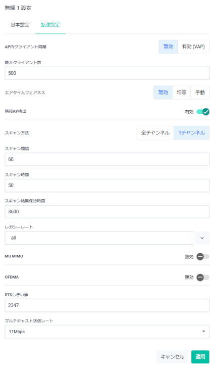 | 最大クライアント数 | 対象無線で接続可能な無線クライアント数を設定します。「0」に設定した場合、無線クライアントはその周波数帯で接続されません。 ・無線1/2:0~500(デフォルトは500) |