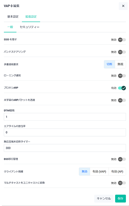 | プロキシARP | プロキシARPの有効、無効を切り替えます。プロキシARPを使用する場合は「有効」、使用しない場合は「無効」を選択します。「有効」を選択すると、無線APに接続されている無線クライアントのIPアドレス宛てのARP要求に代理応答し無線VAPからは送信しません。無線APに接続されていない無線クライアント宛てのARP要求は破棄し、無線VAPから送信されません。 「無効」を選択するとプロキシARPを使用しません。すべてのARP要求は無線VAPから送信されます。デフォルトは「無効」です。 |