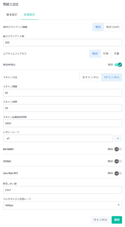 Noteこの機能を有効にすると、現在使用しているチャンネルを周期的に停止して、他のチャンネルをスキャンします。これは、無線APのサービスのパフォーマンスを若干低下させます。この機能を使用する必要がない場合は、無効化して運用することをおすすめいたします。