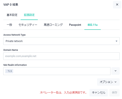 | NAI Realm information | NAI(Network Access Identifier)Realm名(例:example.com、example.org)を入力し、認証方式(TLS、TTLS、SIM、AKA)を選択します。 |