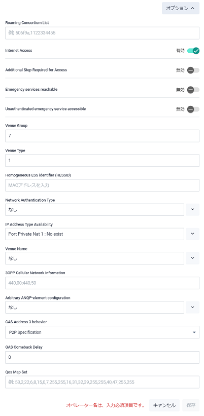 | オプションボタン | 802.11uのオプション設定欄が展開されます。 |