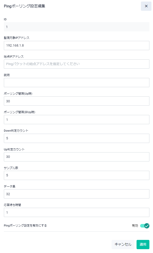 | ID | 編集対象のPingポーリングIDが表示されます。変更はできません |