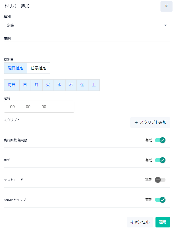 | 有効日 | トリガーを実行する曜日、開始時間、終了時刻を指定します。任意の年月日、開始・終了時刻を指定したい場合は任意指定ボタンをクリックし指定します |