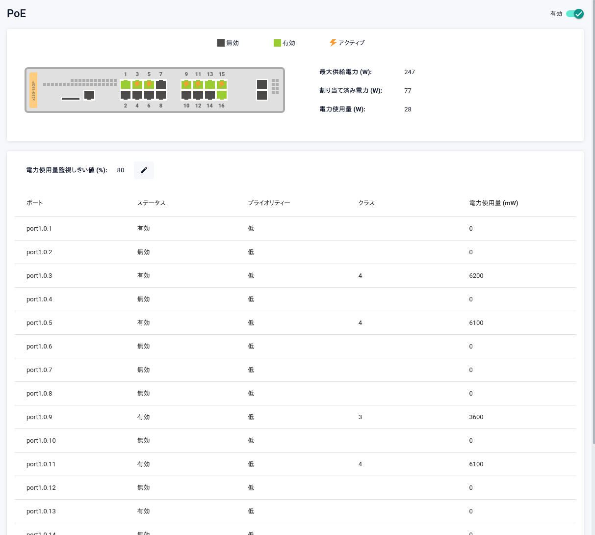 | 無効・有効スライドボタン | システム全体でPoE給電機能の無効・有効を切り替えます |
