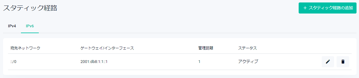 NoteIPv6スタティック経路のゲートウェイ(ネクストホップ)をリンクローカルアドレスで指定する場合はCLIのipv6 routeコマンドをご使用ください。