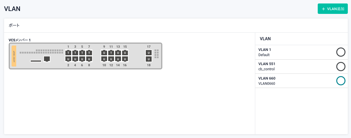 | ポート | 各スイッチポートのタグ設定と所属VLANが視覚的に表示されます。 ・無色U - 初期設定ポート(明示的なVLAN設定のない、vlan1所属のタグなしポート) ・U - タグなしポート(アクセスポート) ・T - タグ付きポート(トランクポート) 各ポートの所属VLANは、該当ポートにマウスカーソルを当てると表示されるポップアップによって確認できます。 また、タグなしポートでは所属VLANが「VLAN」一覧の色でも示されます。 一方タグ付きポートは、「VLAN」一覧で選択中のVLANに所属していれば背景色が該当VLANの色になり、そうでなければ背景色が濃い灰色になります。 ポートをクリックまたはマウスカーソルを当てることで該当ポートのタグ設定と所属VLANの変更およびネイティブVLANの設定をすることもできます。詳細は「タグ設定・所属VLANの変更・ネイティブVLANの設定」をご覧ください |
