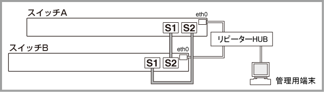 Noteeth0をレジリエンシーリンクだけでなく、通常のマネージメントポートとしても利用したい場合は、eth0間にリピーターHUBをはさんでください。スイッチポートをレジリエンシーリンクに設定する場合は、該当スイッチポートはレジリエンシーリンク専用となり、他の用途には使用できません。なお、リピーターHUBとの接続方法については、リピーターHUBのマニュアルをご参照ください。また、以降の説明ではeth0同士をUTPケーブルで直結しているものと仮定しています。
