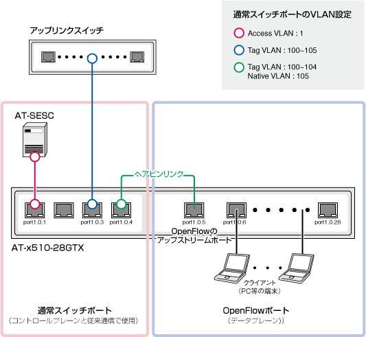 | OpenFlowポート | タグなし | OpenFlowで通信制御するクライアント接続に使用 データプレーンのアップリンクとしても使用 |