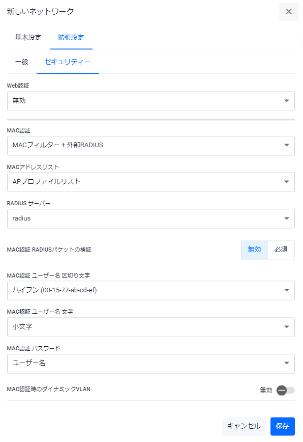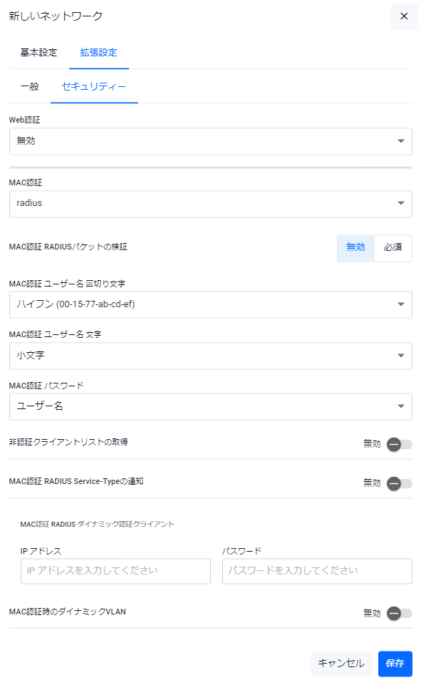 | RADIUS 認証グループ | 認証用RADIUSサーバーグループを選択します。デフォルトは「無効」です。 |