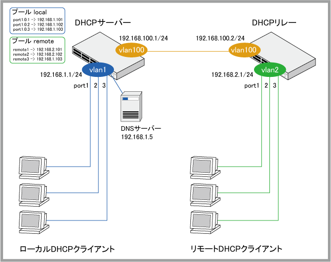 client-id CLIENTIDパラメーターを利用して各クライアントに固定のIPアドレスを割り当てるよう設定します。awplus(dhcp-config)# host 192.168.2.101 client-id remote1 ↓ awplus(dhcp-config)# host 192.168.2.102 client-id remote2 ↓ awplus(dhcp-config)# host 192.168.2.103 client-id remote3 ↓