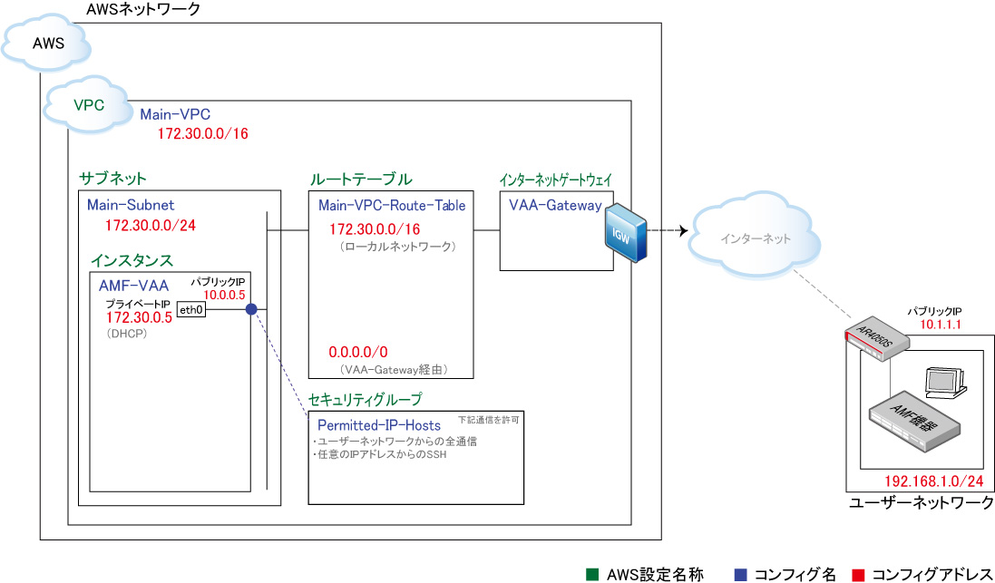 ただし、AMF Cloud自身にはプライベートIPアドレス(172.30.0.5)が設定されており、AMF CloudのパブリックIPアドレス(10.0.0.5)はAWSのNAT機能で変換されたものであることから、ARルーター側でISAKMP接続時にAMF Cloudを正しく識別できるよう、tunnel local name で自装置の名前(ホスト名形式文字列)を送信するよう設定する必要があります。