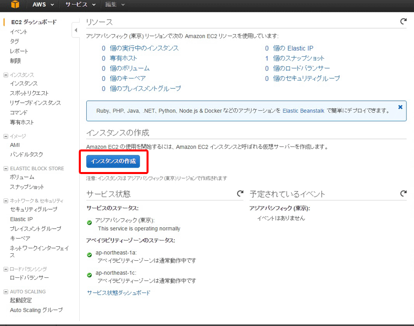 EC2 ダッシュボードで [インスタンス] をクリックします。