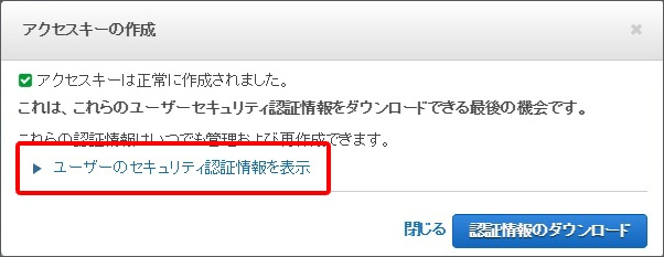 [ユーザーのセキュリティ認証情報を表示] をクリックし、認証情報を確認してください。