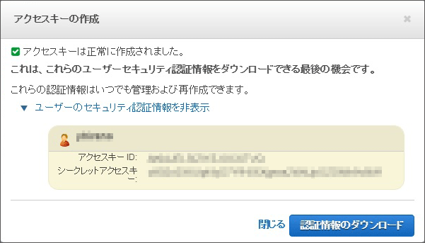 これでAWS APIキーの作成は完了です。