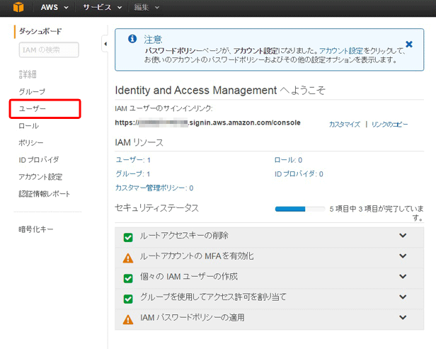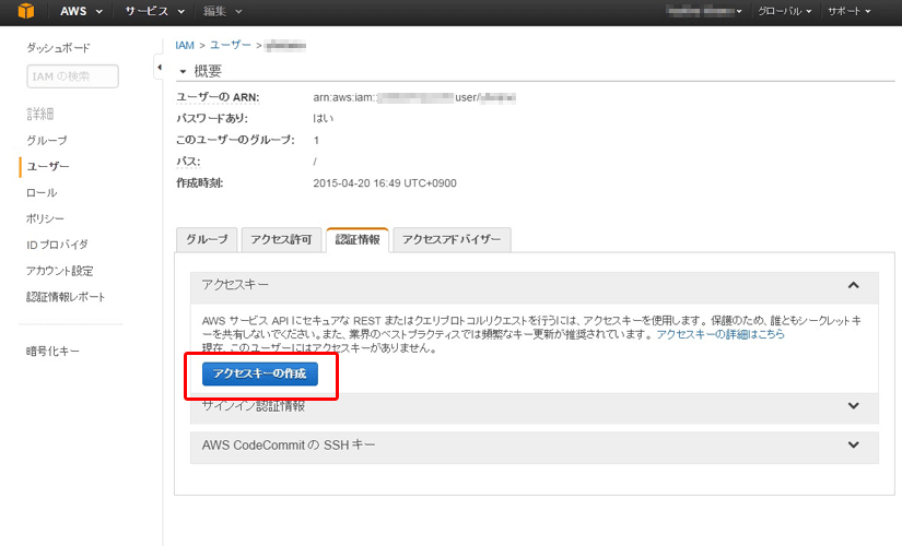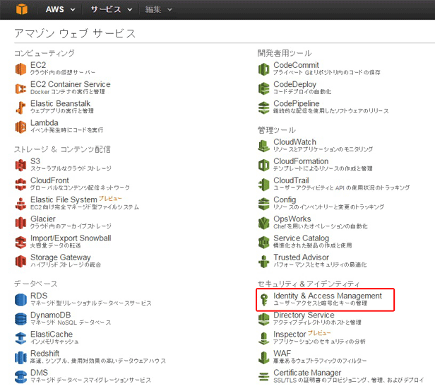 APIキーを作成するには、ユーザーアクセスと暗号化キーの管理サービス「Identity and Access Management(以下、IAM)」の実行権限を持っている必要があります。詳細はAmazon社のユーザーガイドを参照してください。