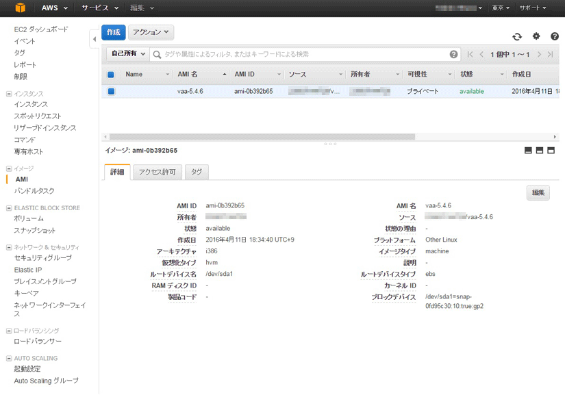 作成したスナップショットイメージは、 [イメージ] > [AMI] で確認できます。