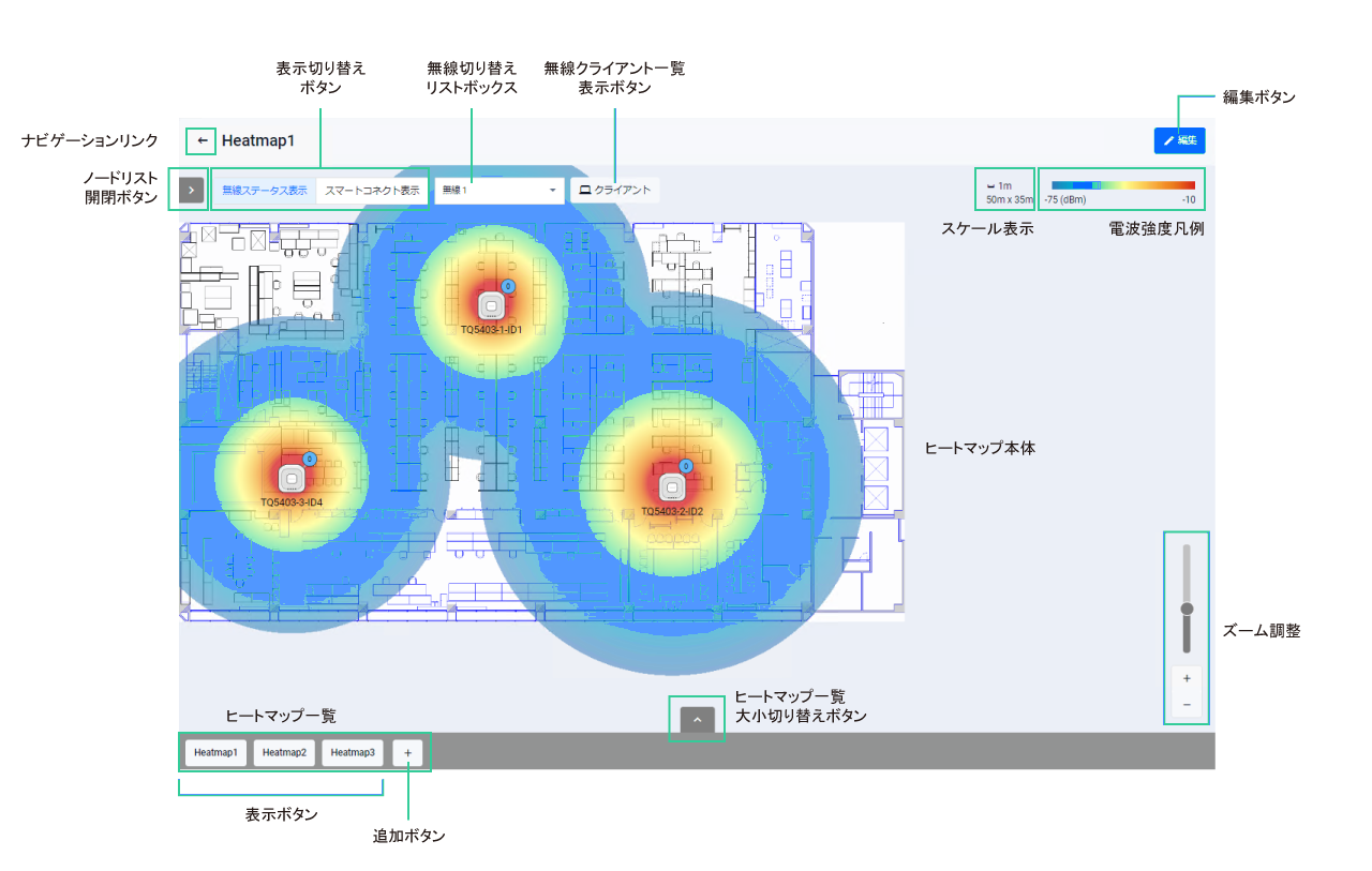 ヒートマップ編集画面では、背景画像やスケール(縮尺)、AP配置の変更やヒートマップの削除が可能です。