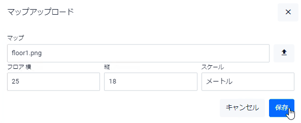 アップロード画像選択(上向き矢印)ボタンを押して画像ファイルを選択し、さらに「スケール」欄でマップ上における背景画像領域の実サイズを指定して、「保存」ボタンをクリックします。