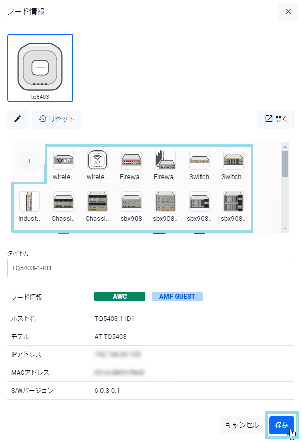 無線LANコントローラーの管理下にある場合はAMFゲストノードかどうかにかかわらず「AWC」と表示され、無線LANコントローラーの管理下にないAMFゲストノードの場合は「Guest」と表示されます。