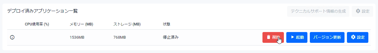 | バージョン更新ボタン | アプリケーションイメージのバージョンを変更したいときは、インスタンスを停止してからこのボタンをクリックしてください |