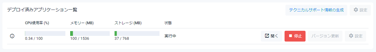 | 開く/削除ボタン | インスタンス実行中は「開く」ボタン、オフライン時は「削除」ボタンになります。「開く」はインスタンスのWeb画面を別ウィンドウで開き、「削除」はインスタンスの削除を行います |