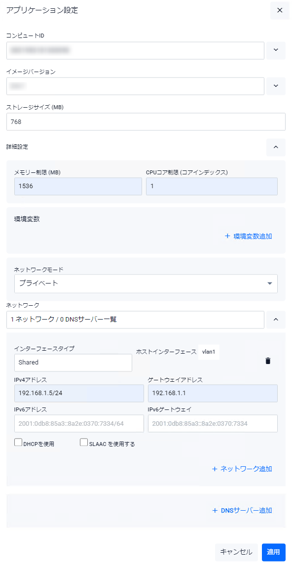 Noteストレージサイズ (MB)、メモリー制限 (MB)、CPUコア制限 (コアインデックス)、インターフェースタイプ、「DHCPを使用」は、前表の「設定内容」に記載の値以外サポート対象外となります。