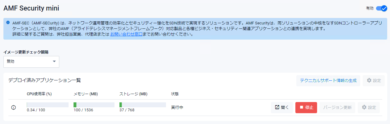 Noteバージョン 2.2.x以前からバージョン2.5.x以降へバージョン更新を行った場合は、AMF Security miniにライセンスをインストールする必要があります。AMF Security miniのライセンスについては『AMF Security miniリファレンスマニュアル』の『設定画面へのアクセス / 設定の開始 / ライセンスのインストール』をご参照ください。