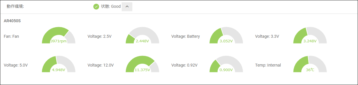 | 動作環境 | 動作環境の全体ステータスが表示されます。下向き矢印をクリックすると、動作環境の詳細な情報が表示されます |